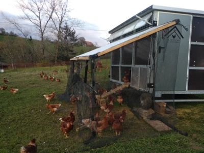 Unsere Hühner leben in einem mobilen Hühnerstall.